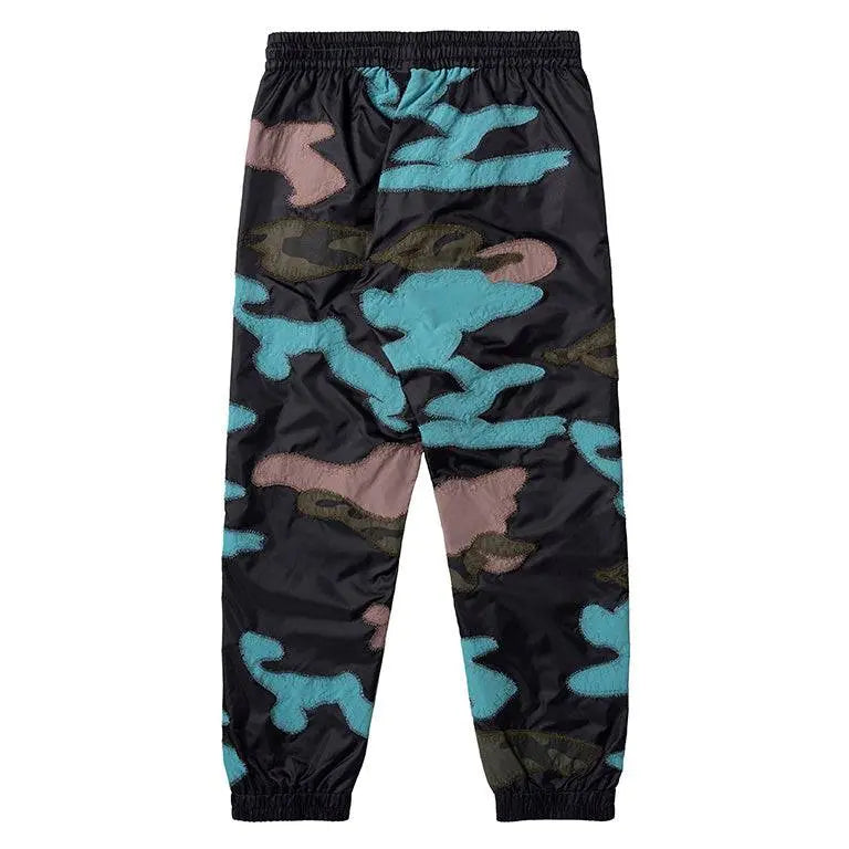These pants feature a striking design with camouflage-shaped fabric appliqués, securely stitched with heavy-duty zig-zag detailing for added durability. The unique blend of earthy tones and vibrant accents creates a contemporary look that sets you apart. Made from lightweight material, these pants offer all-day comfort. With practical zip pockets for convenience, they seamlessly combine style and functionality. Embrace your adventurous spirit with these eye-catching, versatile pants that elevate any casual outfit.