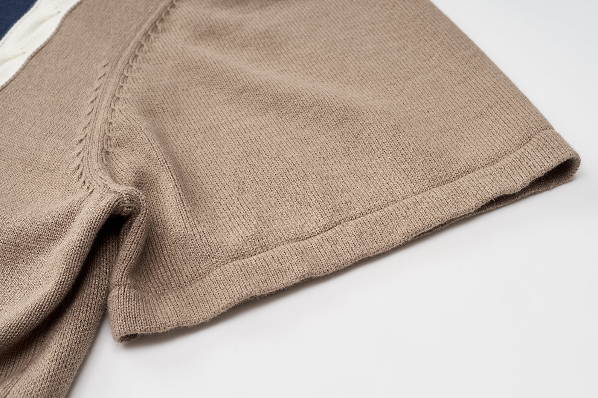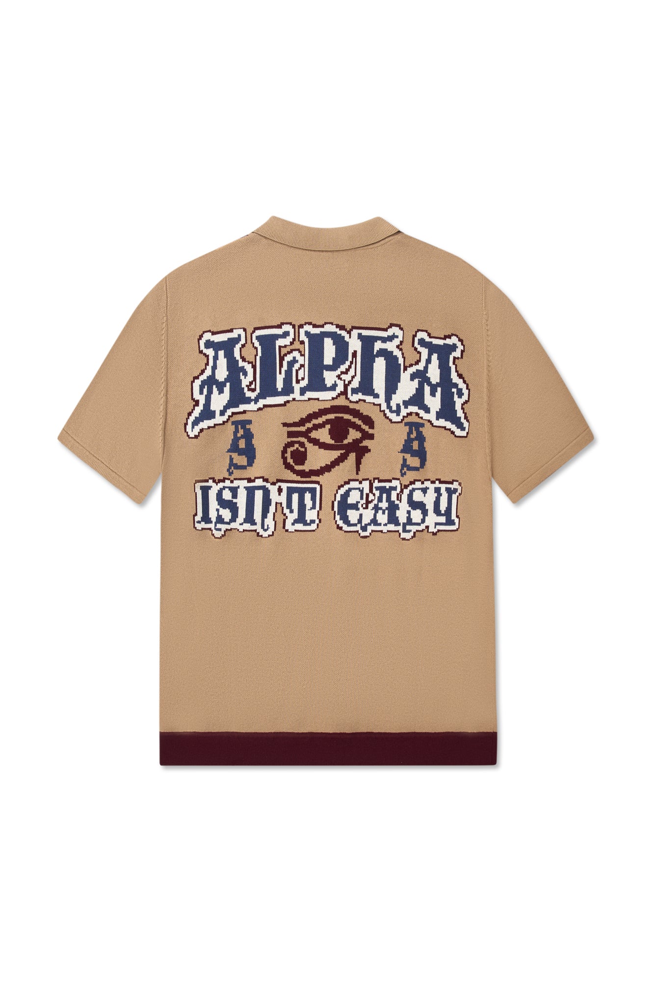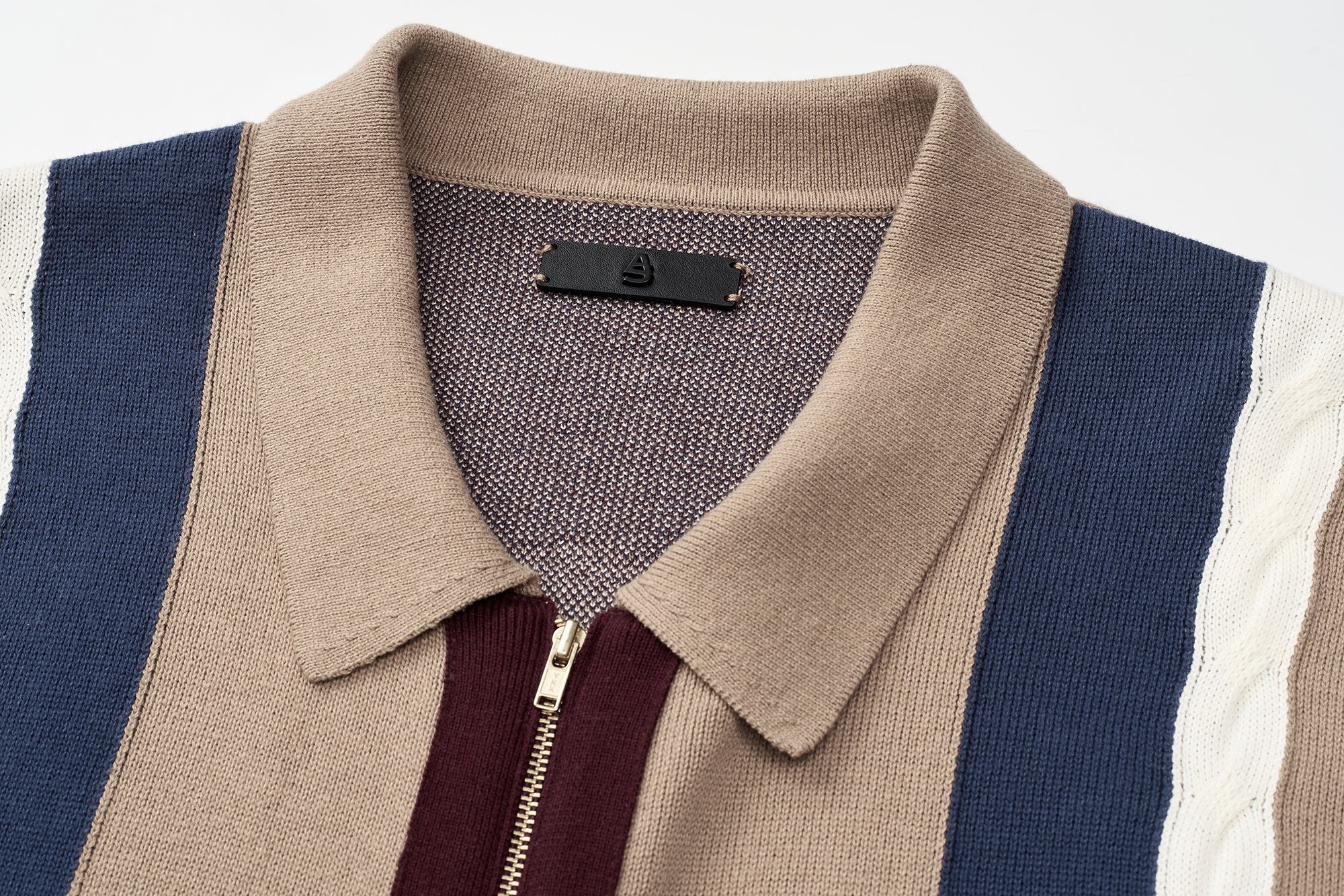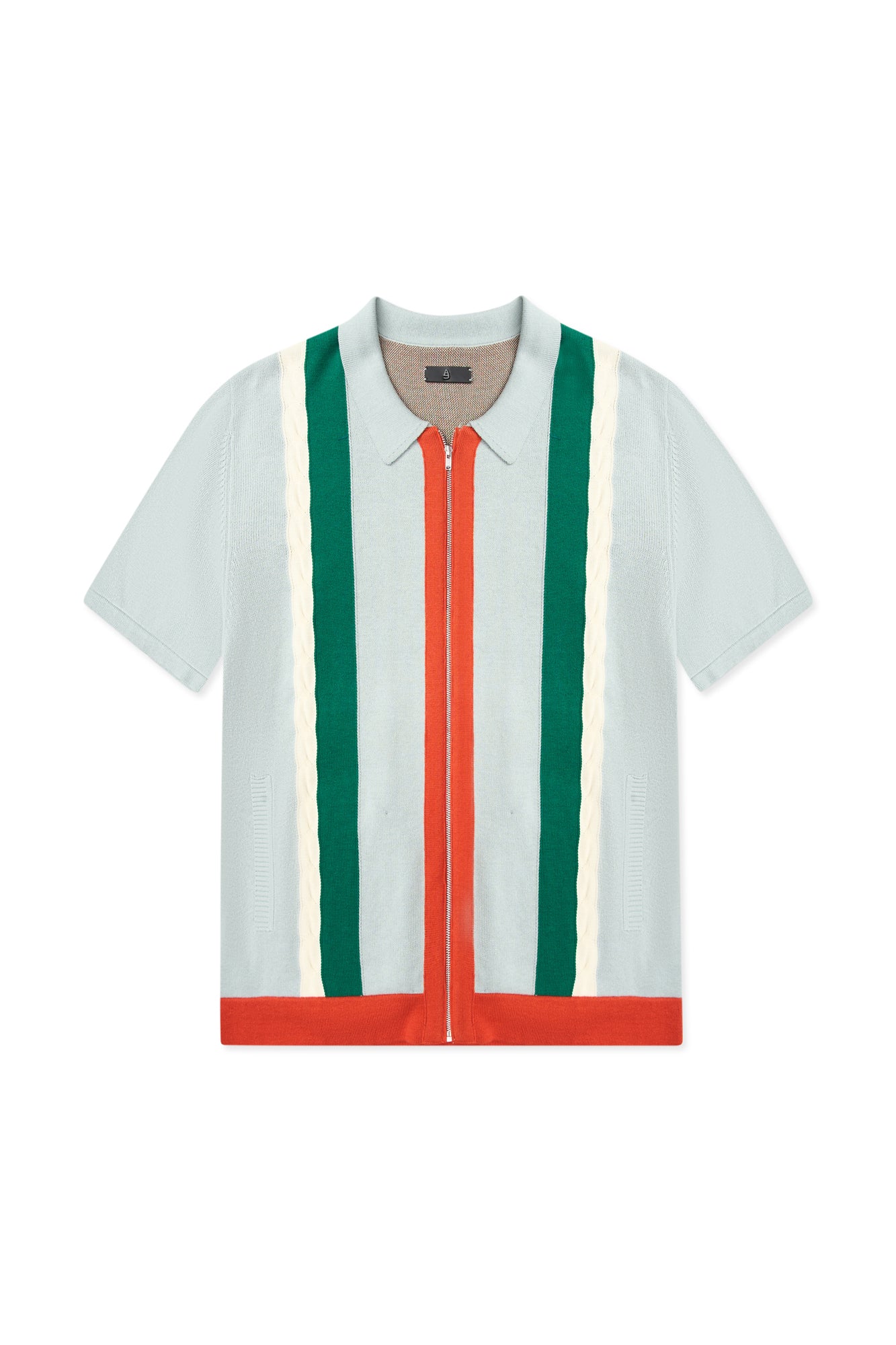 This cotton knit shirt blends retro inspiration with modern detailing. Crafted from breathable cotton knitwear, it features short sleeves and a clean zip-front opening for versatile styling. The design stands out with contrasting colors at the front placket, waistband, cable accents, and vertical front stripes, creating a bold yet balanced look. Ribbed insert pockets on both sides add functional appeal while maintaining a streamlined silhouette. Finished with a distinctive jacquard graphic pattern on the back, this piece delivers texture, comfort, and statement design in one elevated knit essential.
