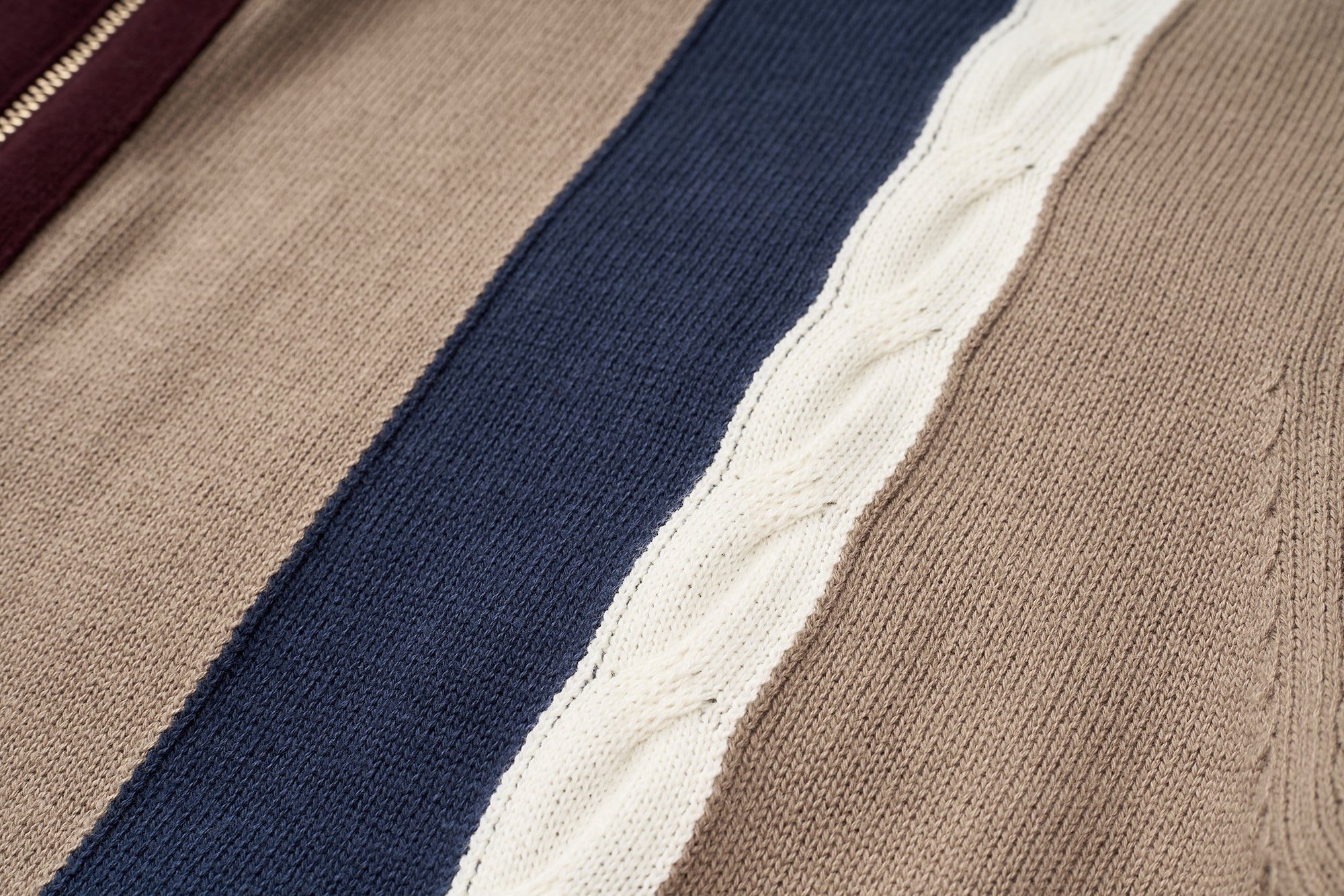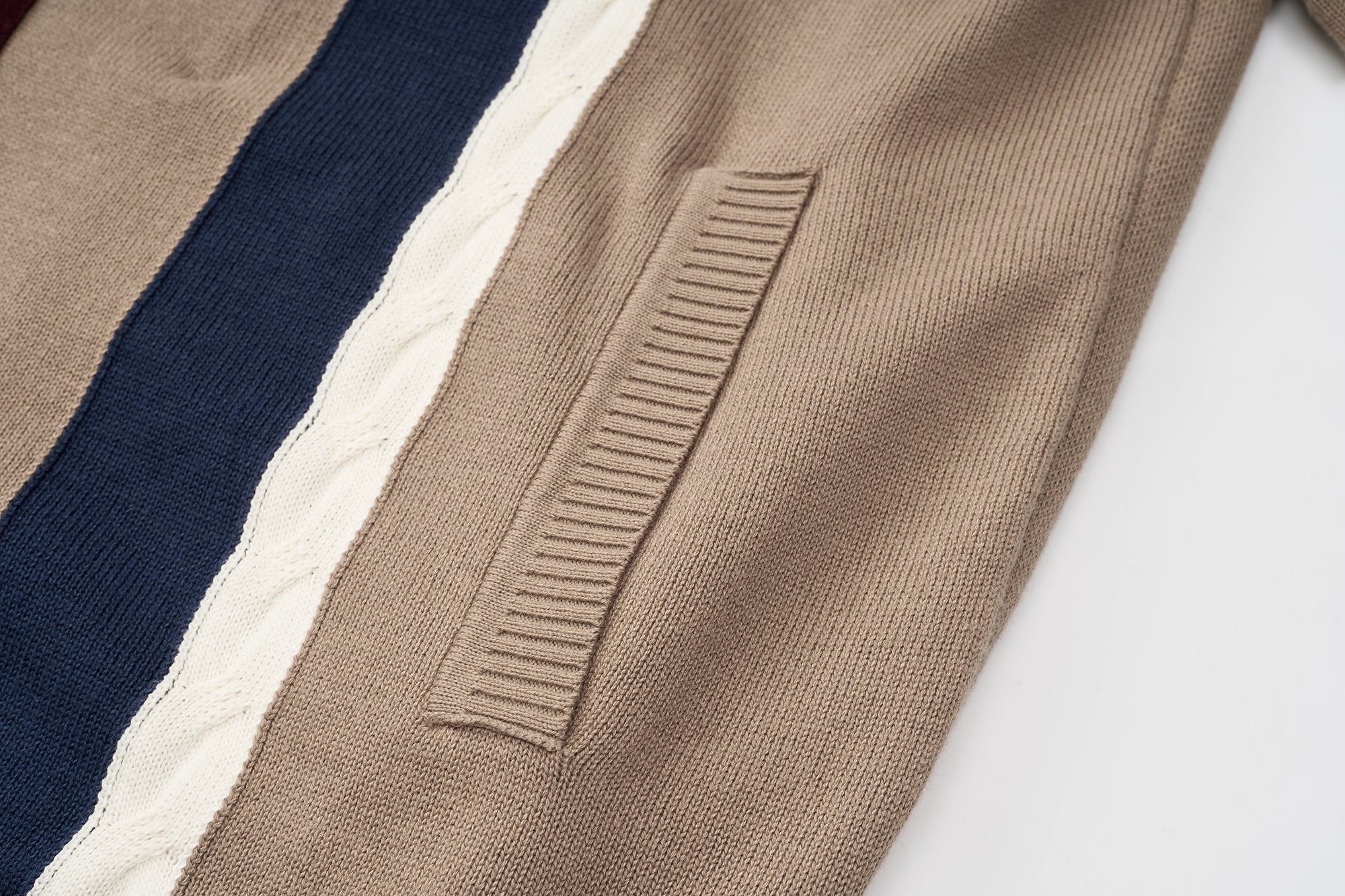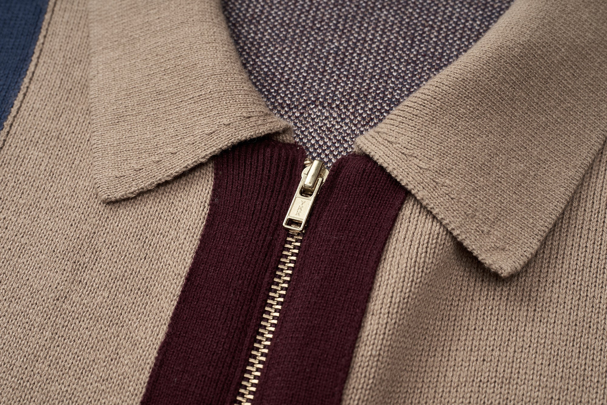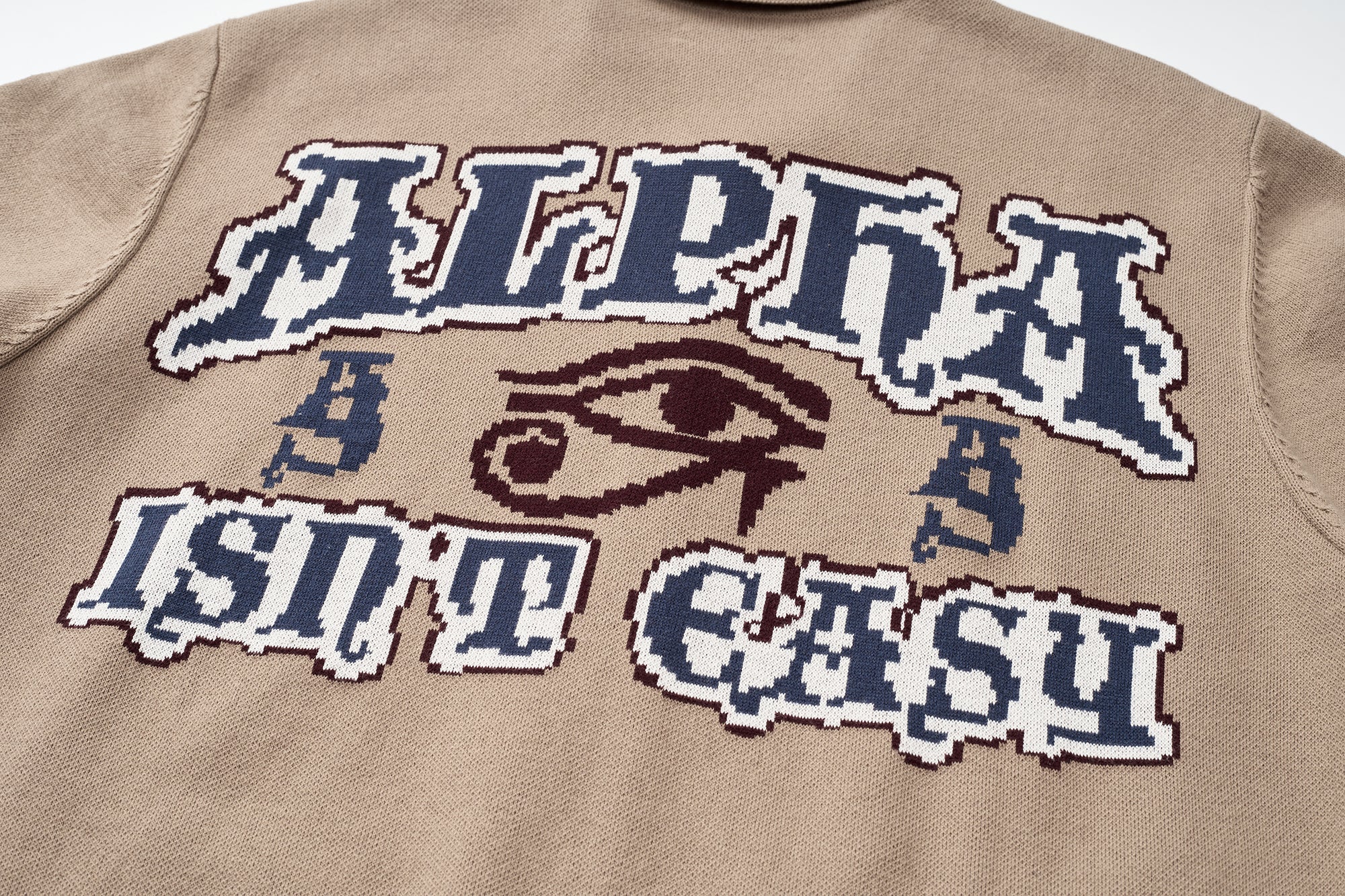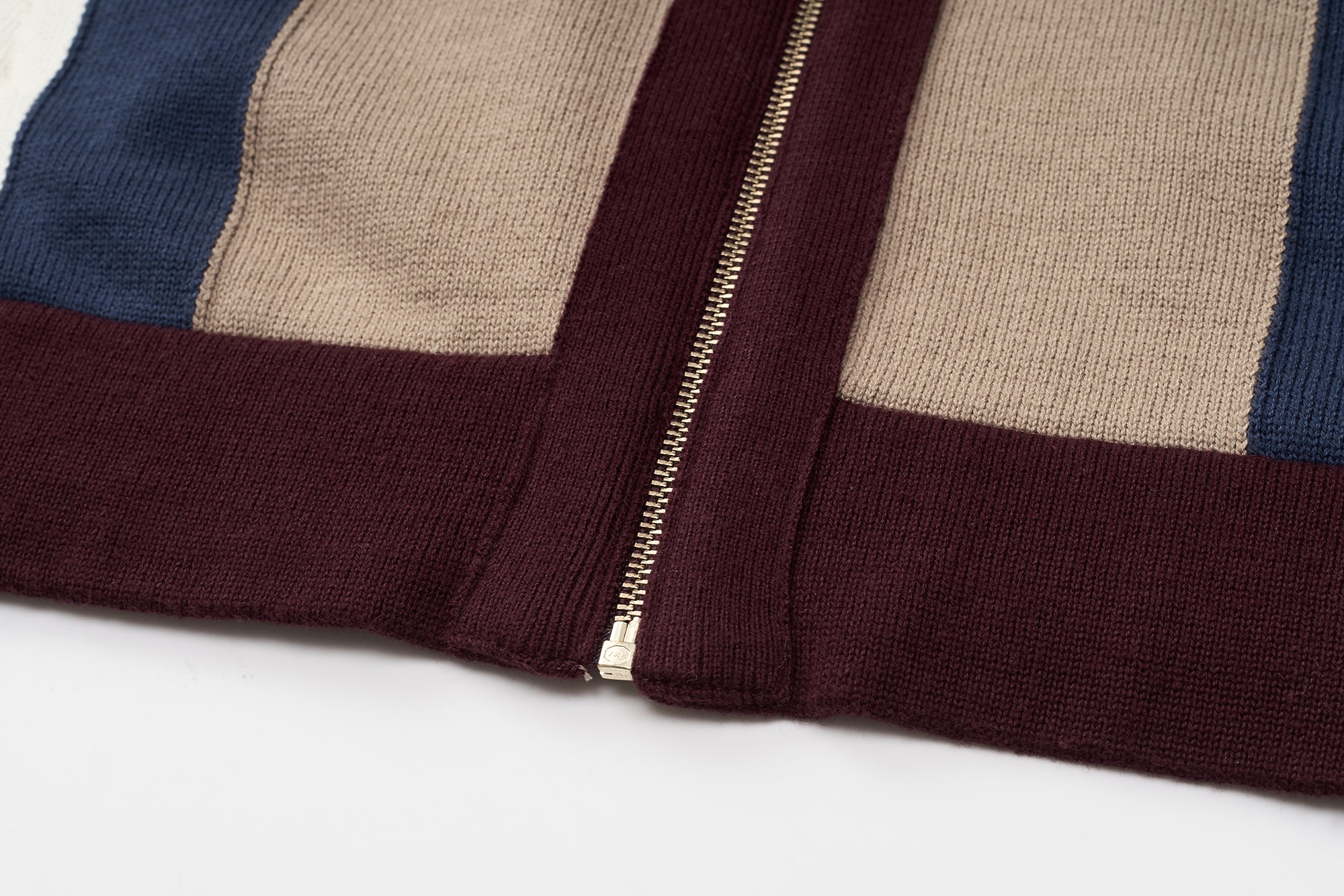 This cotton knit shirt blends retro inspiration with modern detailing. Crafted from breathable cotton knitwear, it features short sleeves and a clean zip-front opening for versatile styling. The design stands out with contrasting colors at the front placket, waistband, cable accents, and vertical front stripes, creating a bold yet balanced look. Ribbed insert pockets on both sides add functional appeal while maintaining a streamlined silhouette. Finished with a distinctive jacquard graphic pattern on the back, this piece delivers texture, comfort, and statement design in one elevated knit essential.