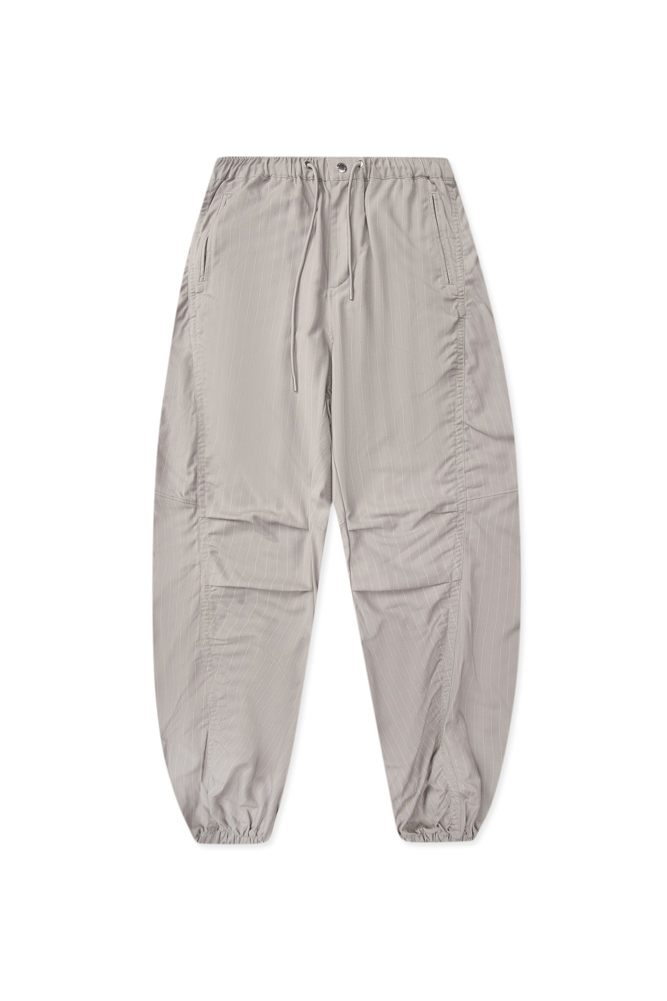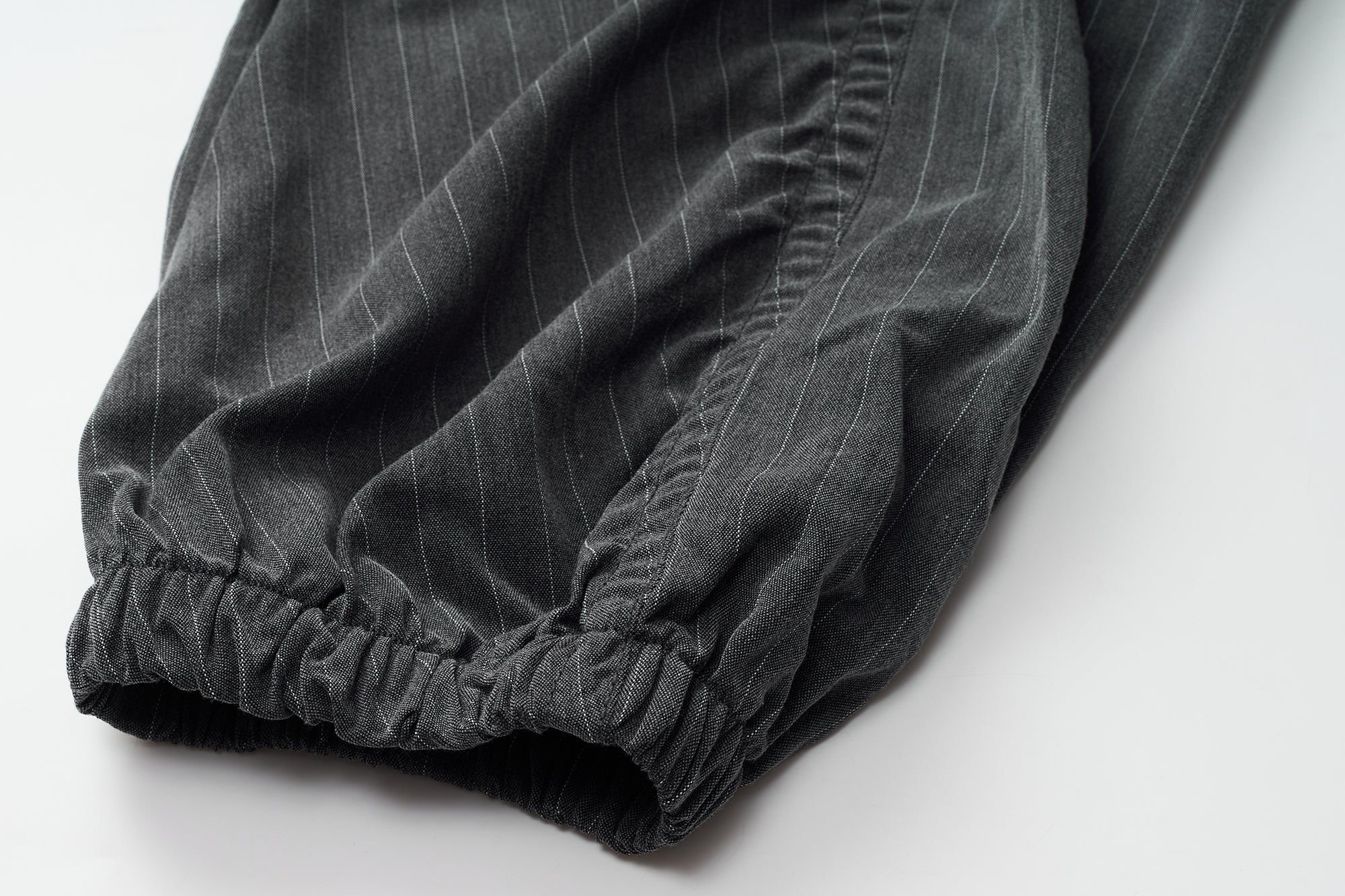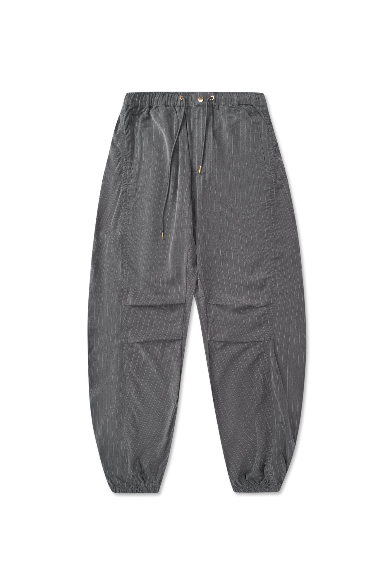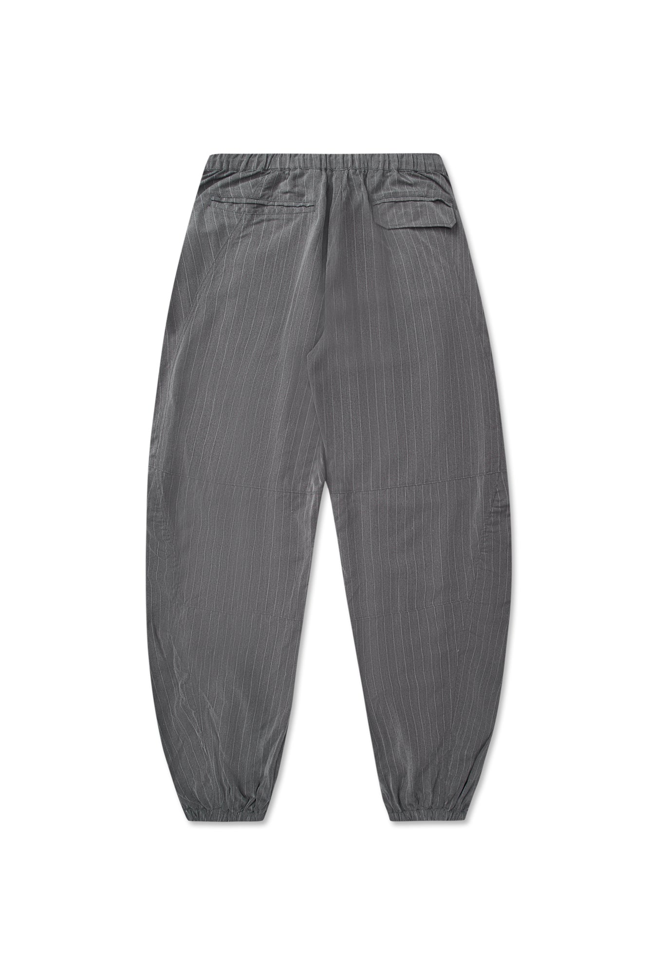 Tailoring codes meet relaxed utility in these barrel-leg trousers cut from classic pinstripe suiting fabric. An elasticated waistband with drawstring delivers everyday comfort, secured with a snap-button closure and zip fly. Logo-embossed hardware on the drawstring tipping and button adds a refined signature. Pleats at the knees enhance movement, while twisted side seams subtly reshape the silhouette. Insert pockets at the sides keep essentials close, balanced by flap pockets at the back. Finished with elasticated hems, they taper with modern attitude. Easy to style yet rich in detail, this pair moves effortlessly between smart and street.
