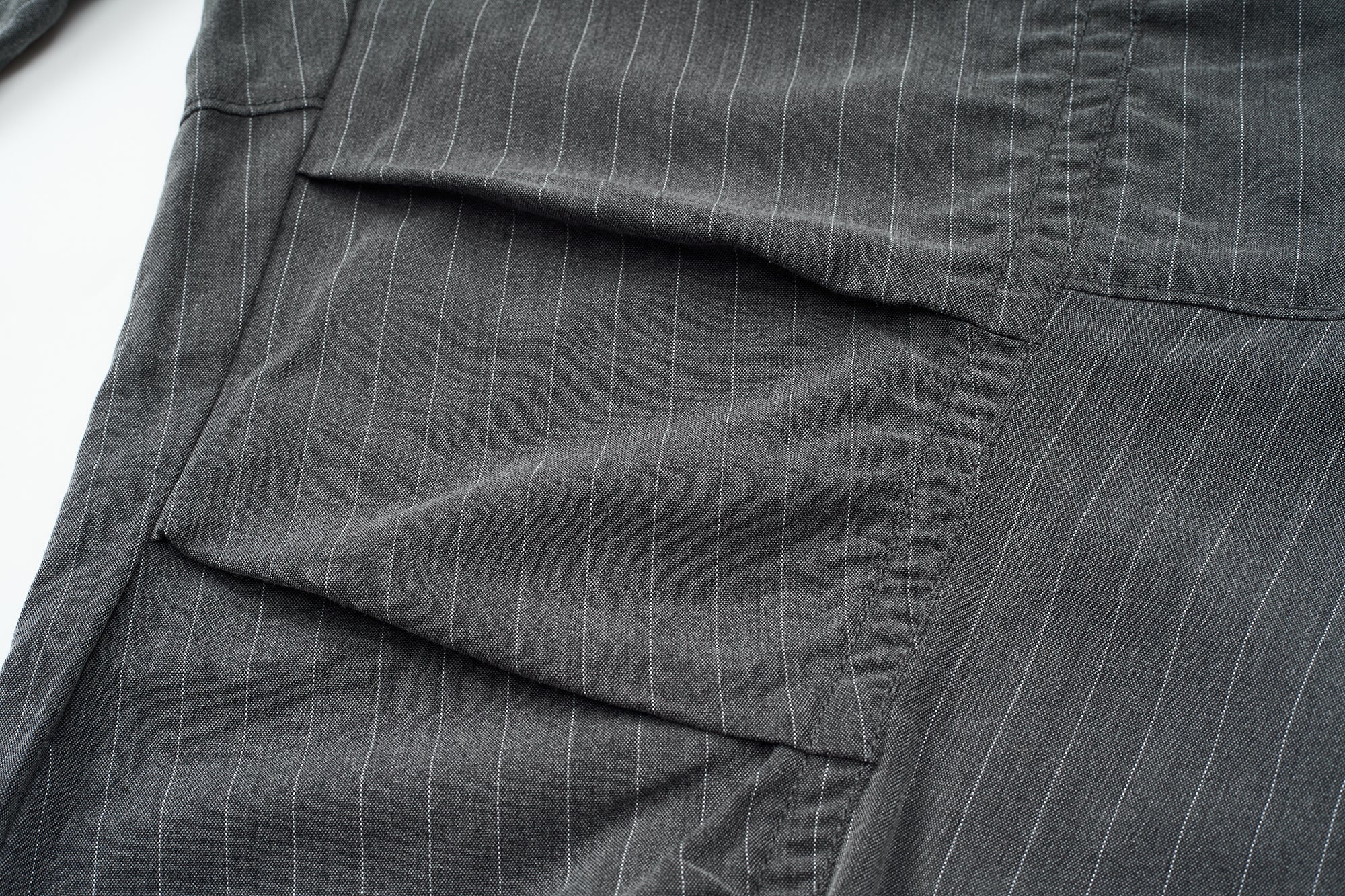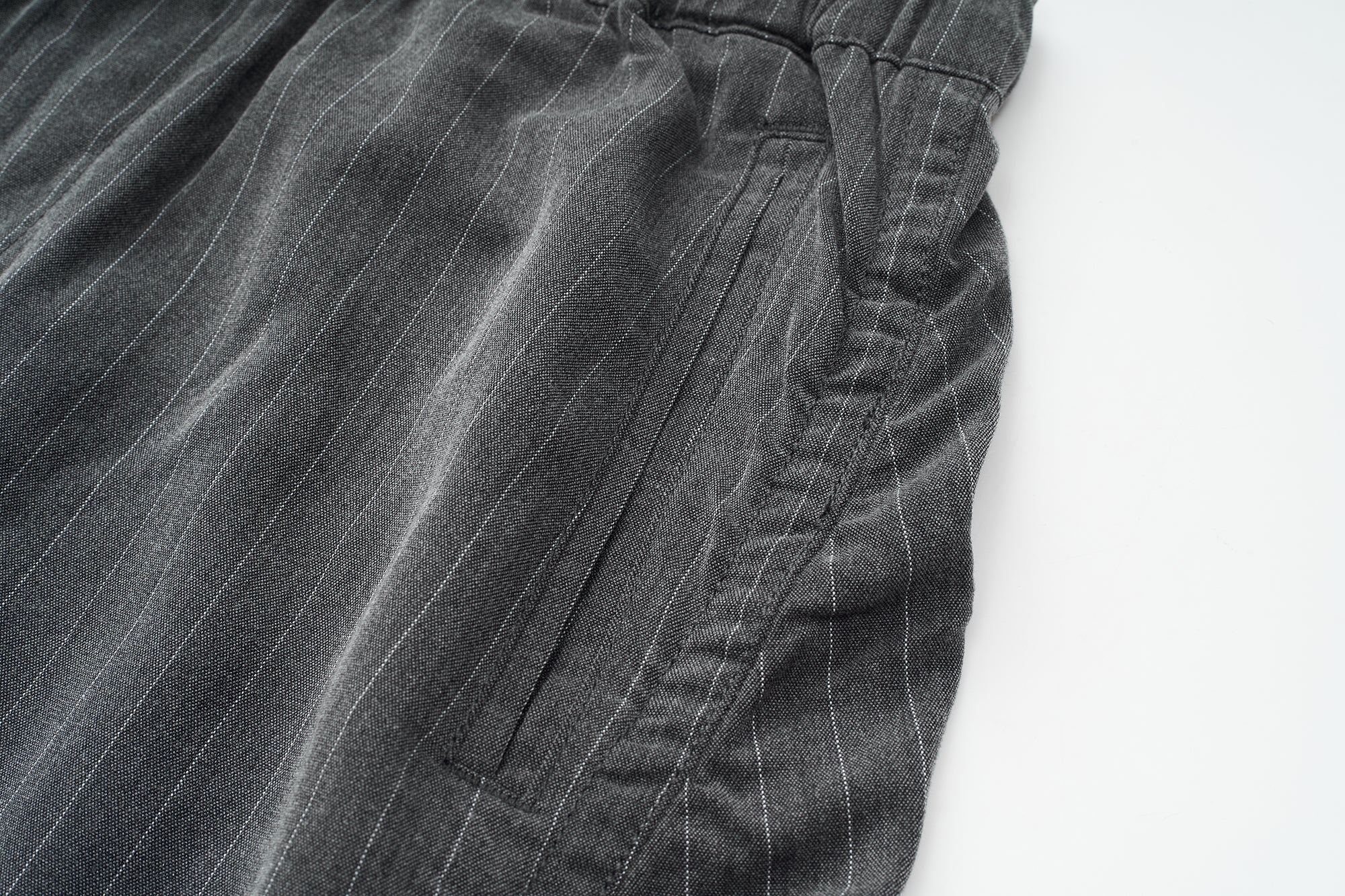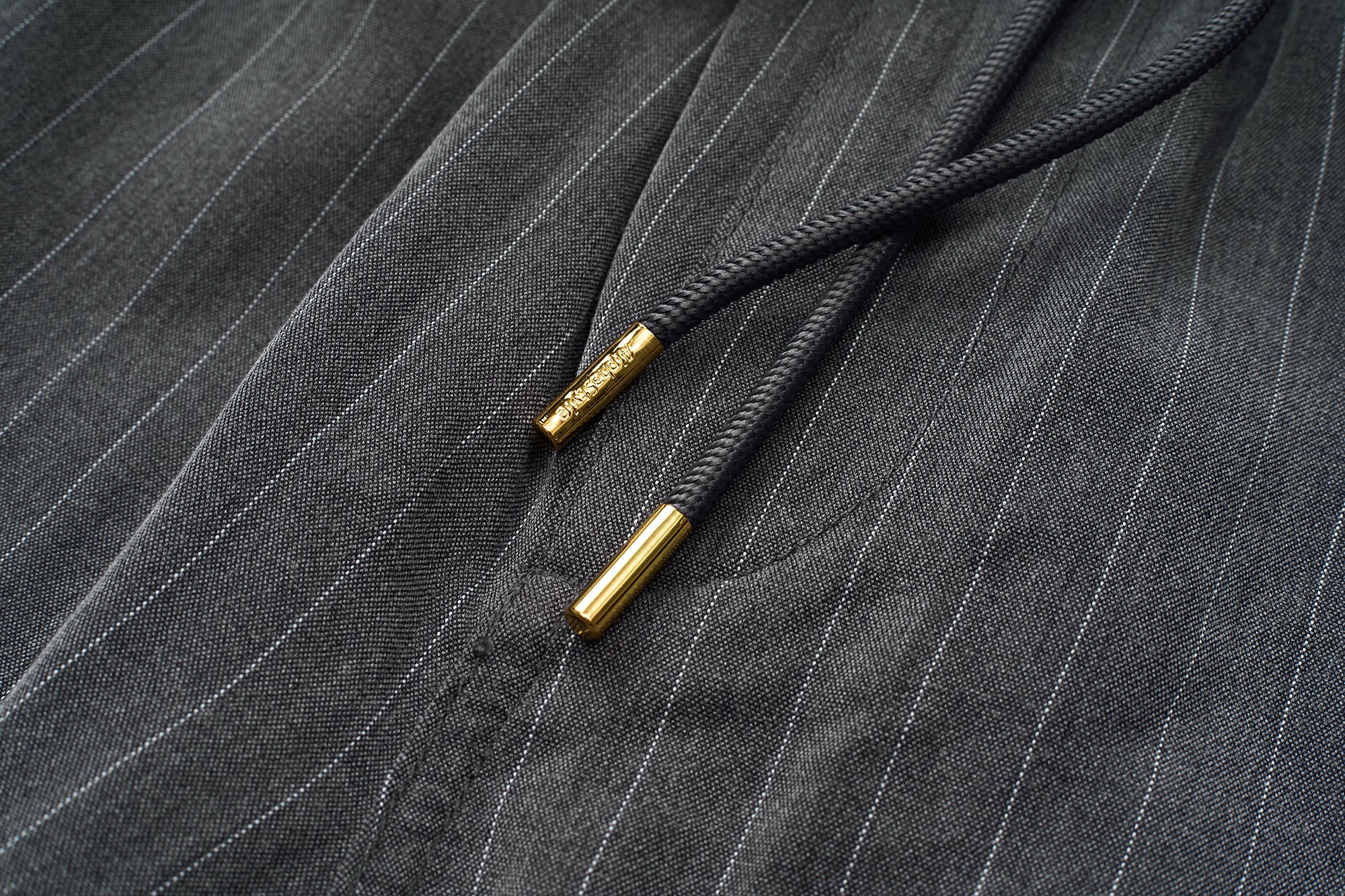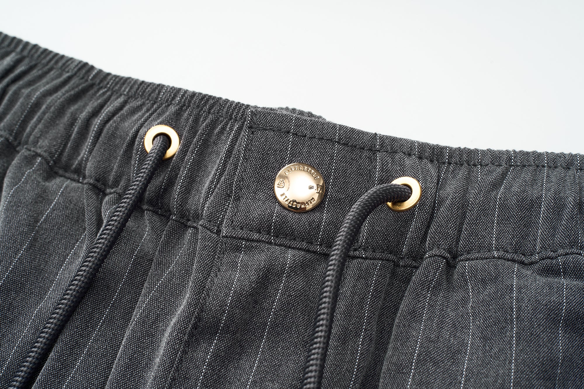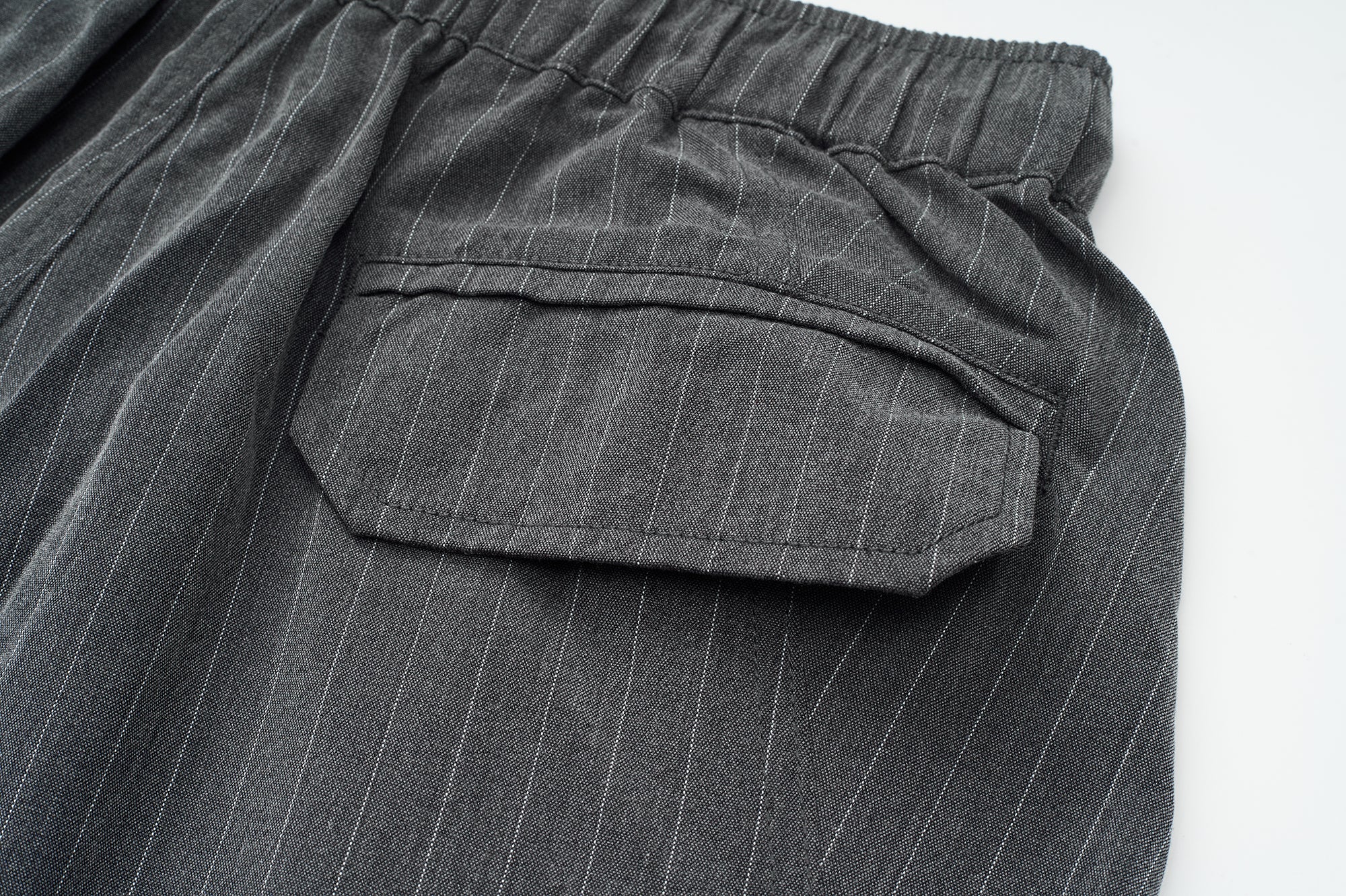 Tailoring codes meet relaxed utility in these barrel-leg trousers cut from classic pinstripe suiting fabric. An elasticated waistband with drawstring delivers everyday comfort, secured with a snap-button closure and zip fly. Logo-embossed hardware on the drawstring tipping and button adds a refined signature. Pleats at the knees enhance movement, while twisted side seams subtly reshape the silhouette. Insert pockets at the sides keep essentials close, balanced by flap pockets at the back. Finished with elasticated hems, they taper with modern attitude. Easy to style yet rich in detail, this pair moves effortlessly between smart and street.