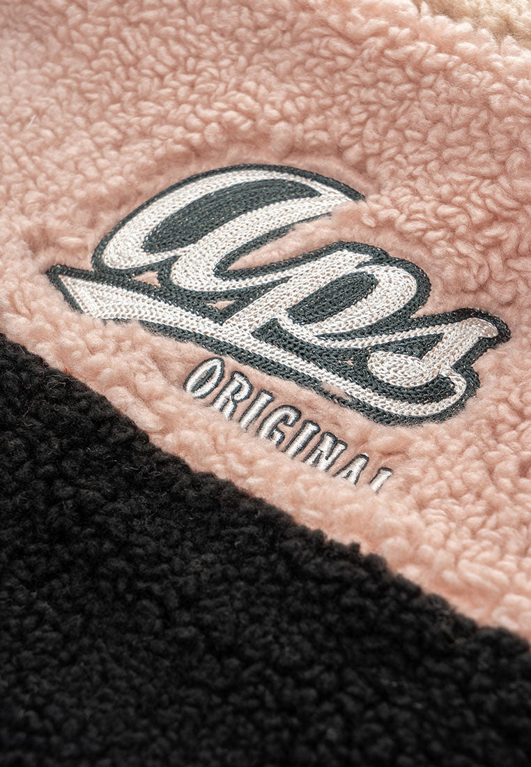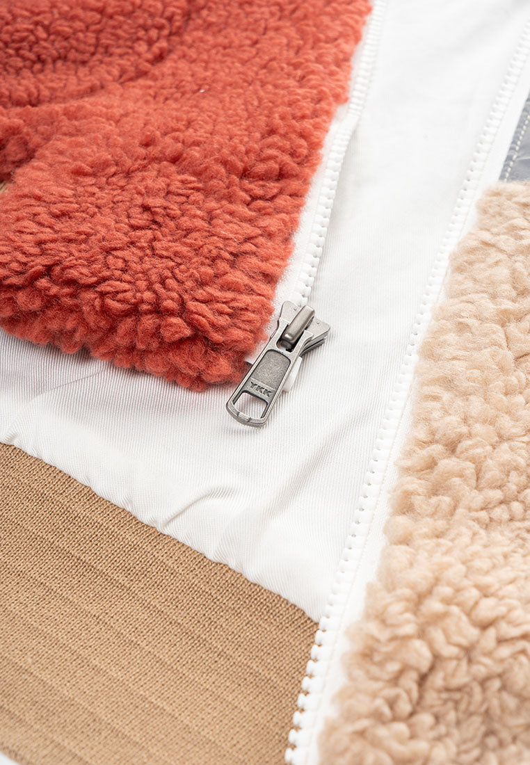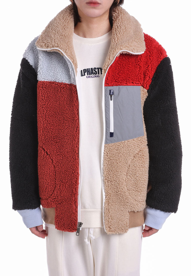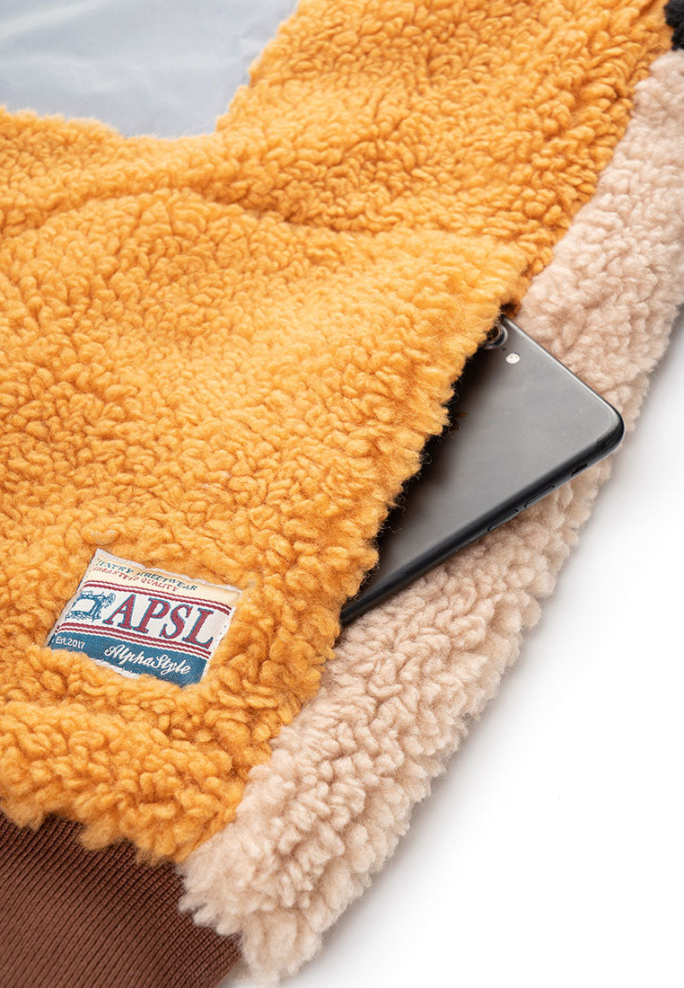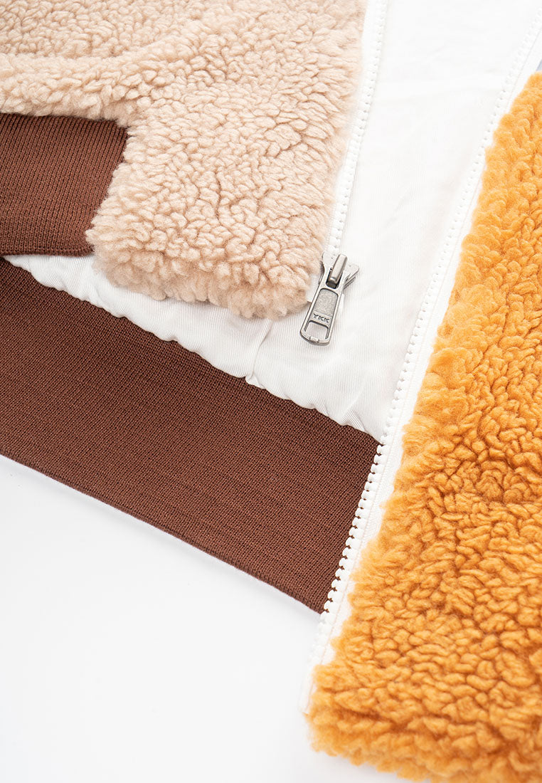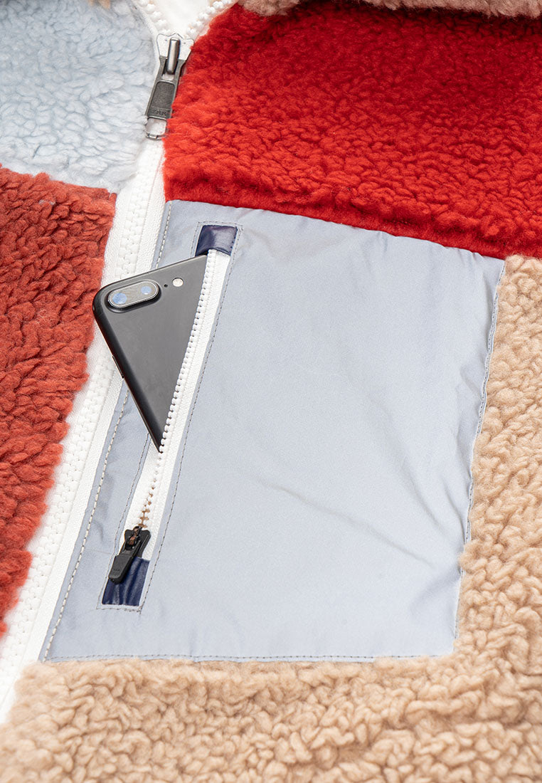 Stay warm in style with our Trish Vegan Sherpa Bomber Jacket, designed for ultimate comfort and everyday wear. Designed with a bold color-blocking pattern, this piece delivers a modern edge while keeping the cozy comfort you love. The oversized mock collar and ribbed cuffs and waistband lock in warmth, creating a snug and structured fit. A zip pocket on the chest offers easy access to your phone, while insert pockets on both sides keep your essentials close. The durable front zipper ensures long-lasting use, and the chainstitch embroidery on the back adds a standout finishing touch that elevates the street-ready aesthetic. Perfect for cold days or laid-back weekends, this jacket blends function, comfort, and style, making it a go-to piece for those who appreciate modern design with a touch of attitude.